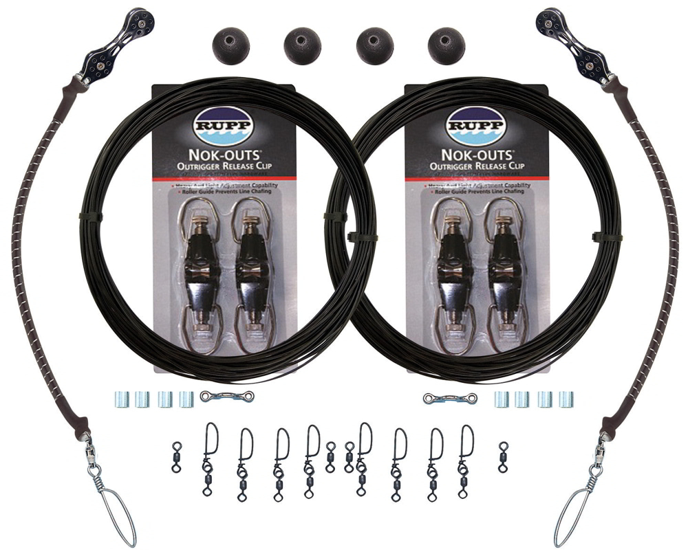 Complete rigging packages that allow you to run two (2) lines on EACH rigger. This kit includes: (2) exclusive Rupp double pulley shock cords, 360ft of 400lb BLACK MONO halyard lines (two 80ft, two 100ft), two pair of Rupp release clips, (4) Nylon ball stops, (2) Strap Eyes, (8) Heavy Snap Swivels, (4) Swivels, (8) Nickel plated Crimps. Select release clips ZIP CLIPS, KLICKERS and NOK-OUTS from the drop-down menu.