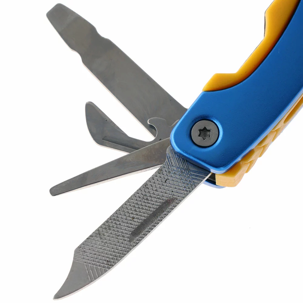 The multi-tool includes the following fold-out tools: pliers, mini flat screwdriver, can opener, large flat screwdriver, nail cleaner, nail file, cross-head screwdriver, bottle opener, saw, and blade.